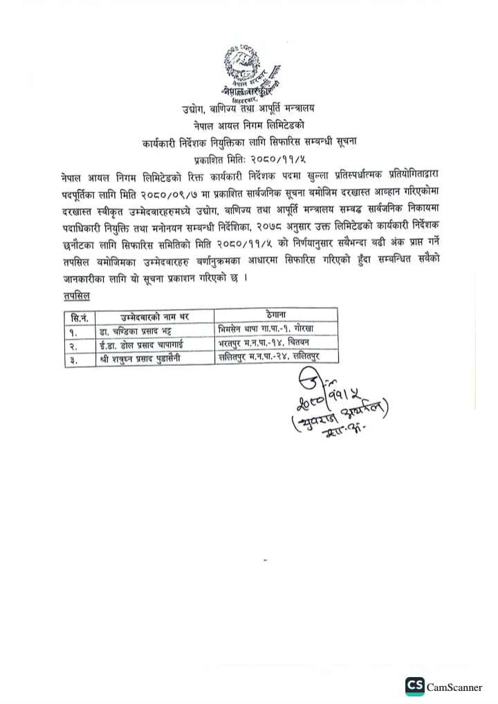 गोरखाका चण्डिकाप्रसाद भट्ट, चितवनका डोलप्रसाद चापागाईं र ललितपुरका शत्रुध्नप्रसाद पुडासैनीलाई कार्यकारी निर्देशक नियुक्तिका लागि सिफारिस गरेको हो ।