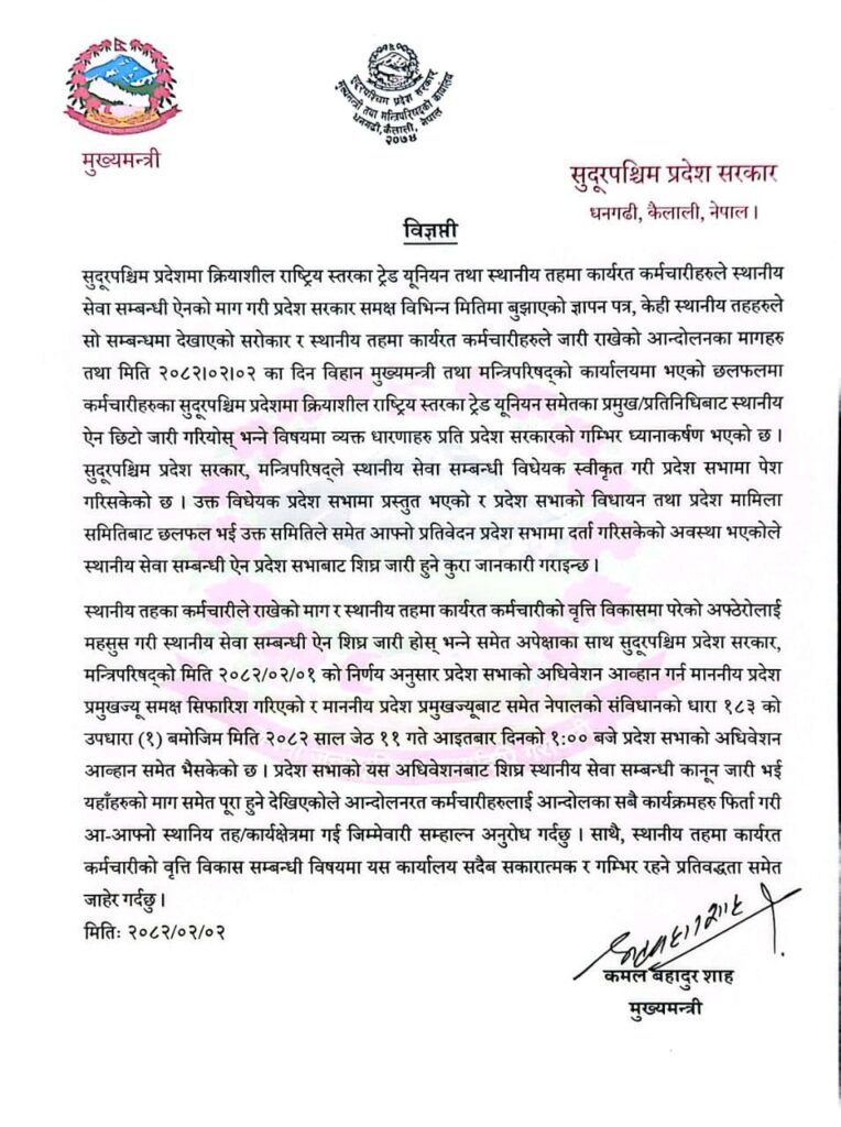 मुख्यमन्त्री शाहले विज्ञप्ति जारी गर्दै कर्मचारीको वृत्ति विकासमा परेको अप्ठेयारालाईसमेत मध्यनजर गरेर स्थानीय सेवा ऐन चाँडै जारी गर्ने भएकाले आन्दोलनका कार्यक्रम फिर्ता लिएर कार्यक्षेत्रमा फर्कन आग्रह गरेका हुन् ।
