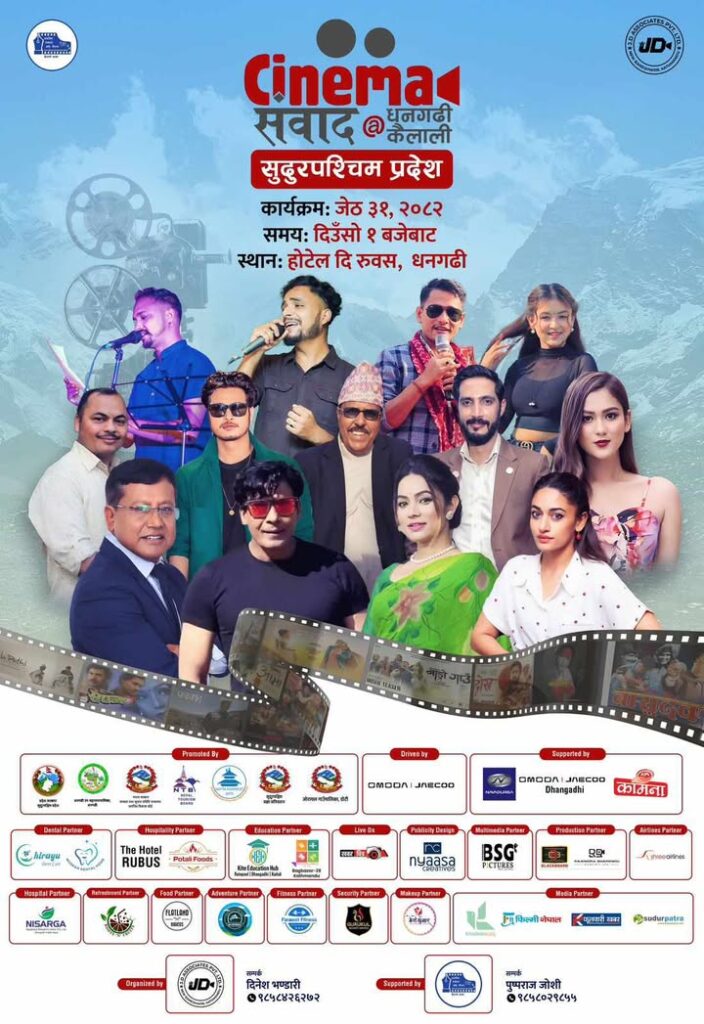 धनगढी : सुदुरपश्चिम प्रदेशमा पहिलो पटक सिनेमा संवाद कार्यक्रम हुने भएको छ । देशका अन्य प्रदेशहरुमा हुदैं आएको सिनेमा संवाद कार्यक्रम सुदुरपश्चिम प्रदेशमा पहिलो पटक आयोजना गर्न थालिएको हो । जेडी एसोसियट्सको आयोजना र चलचित्र पत्रकार संघ नेपाल सुदूरपश्चिमको सहकार्यमा धनगढीमा ‘सिनेमा संवाद’ कार्यक्रम हुने भएको छ । जेठ ३१ गते बहस, संवाद र सांस्कृतिक आदान–प्रदान गर्ने उद्देश्यले सिनेमा संवाद कार्यक्रम गर्न लागेको आयोजक जेडी एसोसियट्सका प्रबन्ध निर्देशक दिनेश भण्डारीले जानकारी दिए ।