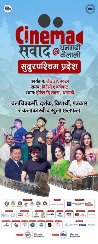 कार्यक्रममा नेपाली चलचित्र क्षेत्रसँग जोडेर सुदुरपश्चिम र यहाँको पर्यटन तथा सम्भावनाका बिषयमा छलफल हुनेछ । सिनेमा संवादमा सहभागी हुन मुलधारका चर्चित कलाकार र कलाकर्मीहरु धनगढी आउने छन् । ‘चलचित्र मनोरञ्जनको साधन मात्र होईन, यो समाजको ऐना हो ।’ प्रबन्ध निर्देशक भण्डारीले भने– ‘स्थानीय स्तरमा नेपाली चलचित्र र कला संस्कृतिको प्रबद्र्धन तथा विस्तारमा महत्वपुर्ण भुमिका खेल्ने अपेक्षा गरेका छौंं ।’