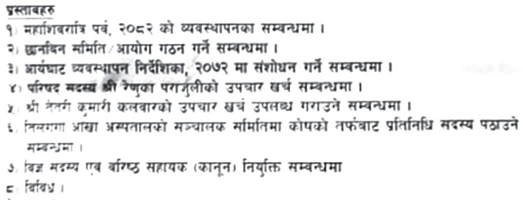 छैटौं एजेन्डामा तिलगंगा आँखा अस्पतालको सञ्चालक समितिमा कोषको तर्फबाट प्रतिनिधि सदस्य पठाउने, ७ मा विज्ञ सदस्य र वरिष्ठ सहायक (कानुन) नियुक्त गर्ने र आठौंमा विविध एजेन्डा सदस्यलाई पठाइएको छ । सदस्यसचिवले कोषको बैठक नै नबसी परिषद्मा पेस गर्न तयार पारेको प्रतिवेदनमा भने आँखा अस्पतालको सञ्चालक समितिका कोषका तर्फबाट परिषद् सदस्य रामेश्वर संगतलाई पठाउने कोषको बैठकले निर्णय गरिसकेको ब्यहोरा उल्लेख छ ।