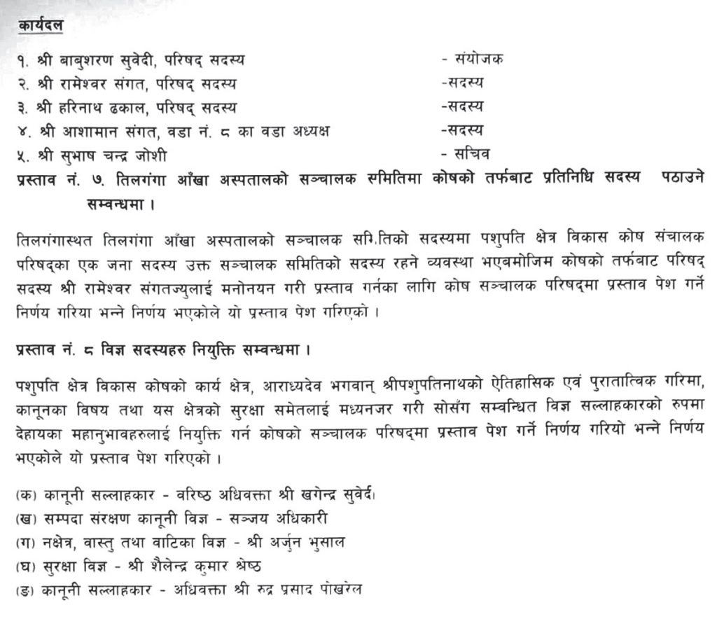 ‘पशुपति क्षेत्र विकास कोषको कार्यक्षेत्र, आराध्यदेव भगवान् श्री पशुपतिनाथको ऐतिहासिक एवं पुरातात्विक गरिमा, कानुनका विषय तथा यस क्षेत्रको सुरक्षासमेतलाई मध्यनजर गरी सोसँग सम्बन्धित विज्ञ सल्लाहकारको रूपमा देहायका महानुभावहरूलाई नियुक्ति गर्न कोष सञ्चालक परिषदमा प्रस्ताव पेस गर्ने निर्णय गरियो भन्ने निर्णय भएकाले यो प्रस्ताव पेस गरियो,’ सदस्यसचिवले परिषदमा पेस गर्न तयार पारेको प्रतिवेदनमा उल्लेख छ ।