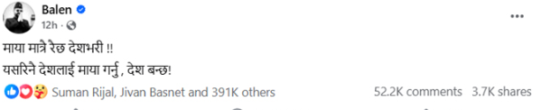 बालेनको भावुक ‘स्ट्याटस’: माया मात्रै रै’छ देशभरि