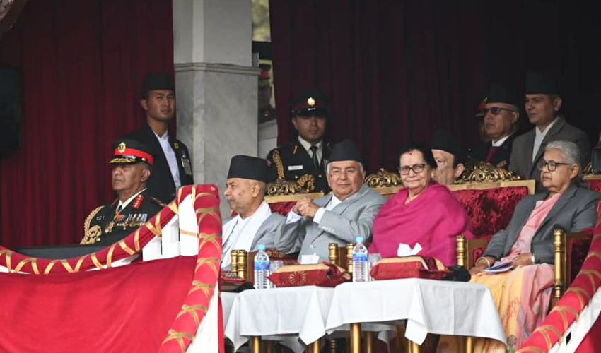 काठमाडौँः राष्ट्रपति रामचन्द्र पौडेल महाशिवरात्रि तथा २६३औँ सेना दिवसका अवसरमा नेपाली सेनाद्वारा सैनिक मञ्च टुँडिखेलमा आज आयोजित विशेष समारोहमा सरिक भए। सो अवसरमा उनले त्यहाँस्थित सैनिक स्मारकमा पुष्पहार अर्पण गरी श्रद्धाञ्जली व्यक्त गर्नुका साथै नेपाली सेनाद्वारा अर्पण गरिएको सलामी ग्रहण गरे।