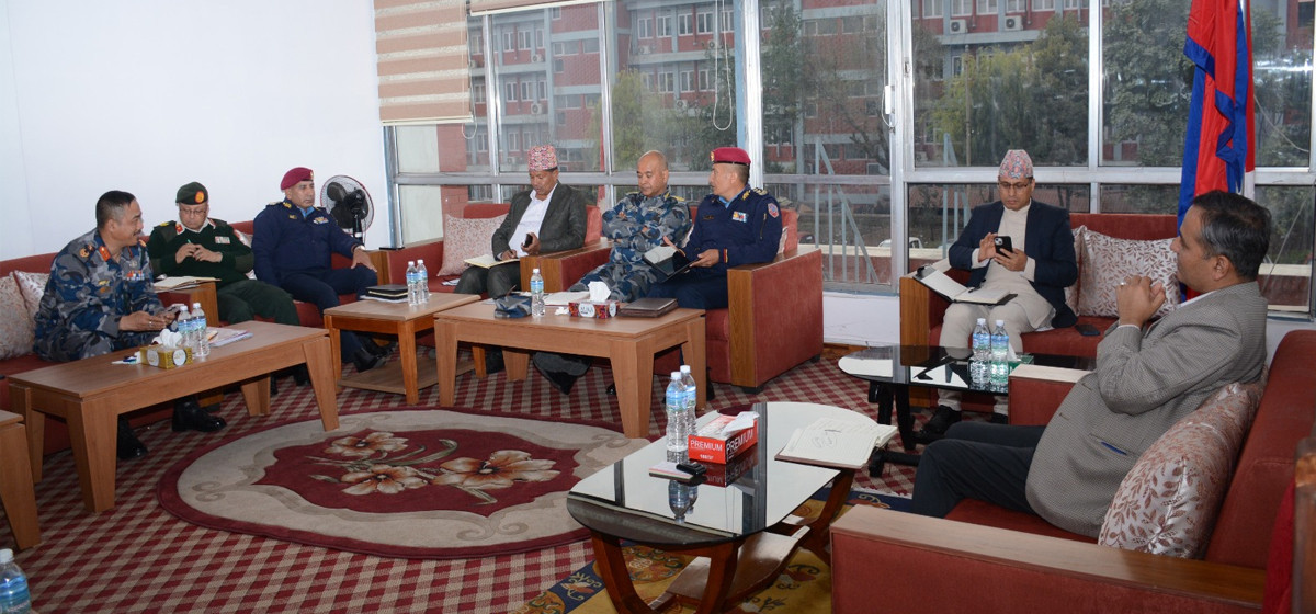 केन्द्रीय सुरक्षा समितिका अध्यक्ष एवं गृहमन्त्री ओमप्रकाश अर्यालको अध्यक्षतामा जारी बैठकमा चारवटै सुरक्षा निकायका उच्च पदाधिकारीहरुको उपस्थिति रहेको छ।