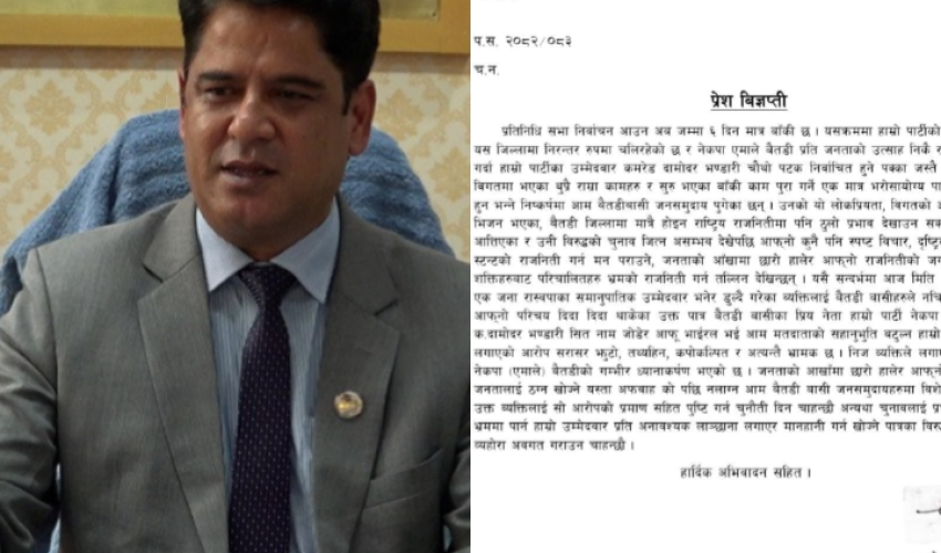 एमालेले पछिल्ला दिनमा सामाजिक सञ्जाल तथा विभिन्न माध्यमबाट उम्मेदवारविरुद्ध फैलाइएका आरोपहरूलाई ‘भ्रामक, तथ्यहीन र कपोलकल्पित’ भन्दै अस्वीकार गरेको छ। विज्ञप्तिमा ती गतिविधि चुनाव नजिकिँदै जाँदा मतदातालाई भ्रमित पार्ने नियोजित प्रयास भएको उल्लेख गरिएको छ।