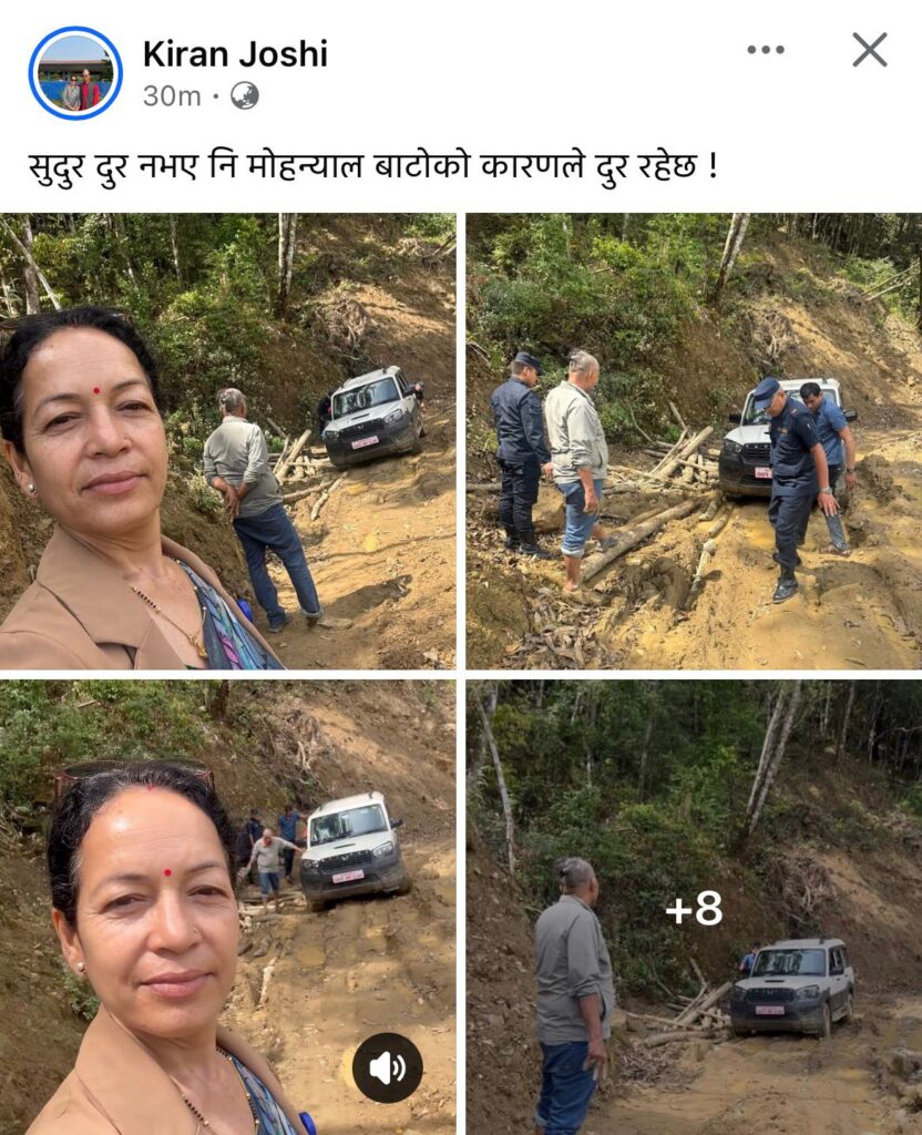 कैलालीका सहायक प्रमुख जिल्ला अधिकारी Kiran Joshi ले सामाजिक सञ्जालमार्फत सडकको वास्तविक अवस्था सार्वजनिक गरेकी छन्। उनले “सुदूर टाढा नभए पनि बाटोको कारणले दूरी महसुस गर्नुपरेको” उल्लेख गर्दै सडकको खराब अवस्थाप्रति ध्यानाकर्षण गराएकी हुन्।