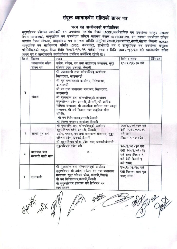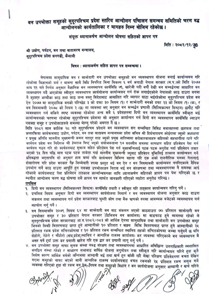 उपभोक्ता समूहहरूले प्रदेश सरकारले गठन गरेको कार्यदलको प्रतिवेदन कार्यान्वयन नगरेको आरोप लगाउँदै वन ऐन र नियमावली कार्यान्वयनमा ढिलाइ हुँदा वन संरक्षण र व्यवस्थापनमै समस्या देखिएको बताएका छन्। सार्वजनिक गरिएको कार्यतालिका अनुसार चैत ३० गते ज्ञापन पत्र बुझाइसकेपछि वैशाख १० देखि १६ गतेसम्म मुख्यमन्त्री तथा मन्त्रिपरिषद्को कार्यालय, मन्त्रालय र प्रदेश सभामा शान्तिपूर्ण धर्ना दिइनेछ भने वैशाख १७ देखि २५ गतेसम्म बिहान ९ देखि १ बजेसम्म प्रदेशभर आंशिक यातायात बन्द गरिनेछ, जहाँ सरकारी सवारी साधन मात्र सञ्चालन हुनेछन्। त्यसपछि वैशाख २८ गतेदेखि मुख्यमन्त्री कार्यालय, मन्त्रालय, वन निर्देशनालय तथा सबै डिभिजन वन कार्यालयहरूमा माग पूरा नभएसम्म तालाबन्दी गर्ने चेतावनी आन्दोलन समितिले दिएको छ।