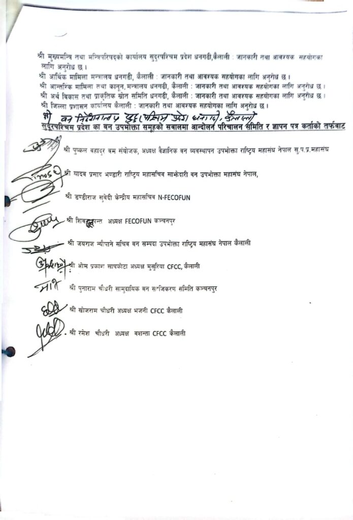 धनगढी :- सुदूरपश्चिम प्रदेशका सामुदायिक तथा साझेदारी वन उपभोक्ता समूहहरूले आफ्ना विभिन्न मागहरू सम्बोधन नभएको भन्दै चरणबद्ध आन्दोलनको घोषणा गरेका छन्। प्रदेशस्तरीय संयुक्त बैठकपछि उनीहरूले उद्योग, पर्यटन, वन तथा वातावरण मन्त्रालय, धनगढीमा ध्यानाकर्षणसहित ज्ञापन पत्र बुझाउँदै दिगो वन व्यवस्थापन कार्यविधि तत्काल लागू गर्न, वन व्यवस्थापनका लागि आवश्यक बजेट तथा सहुलियत ऋणको व्यवस्था गर्न, बहु-कर प्रणाली खारेज गरी एकद्वार कर प्रणाली लागू गर्न र काठ दाउराको संकलन तथा बिक्रीमा उपभोक्ता समूहको अधिकार सुनिश्चित गर्न माग गरेका छन्। उनीहरूको भनाइमा वन व्यवस्थापनसम्बन्धी कार्यविधि लागू नहुँदा काठ दाउरा जंगलमै कुहिने अवस्था आएको छ भने अर्कोतर्फ विदेशबाट काठ आयात गर्नुपर्दा आर्थिक भार बढिरहेको छ।