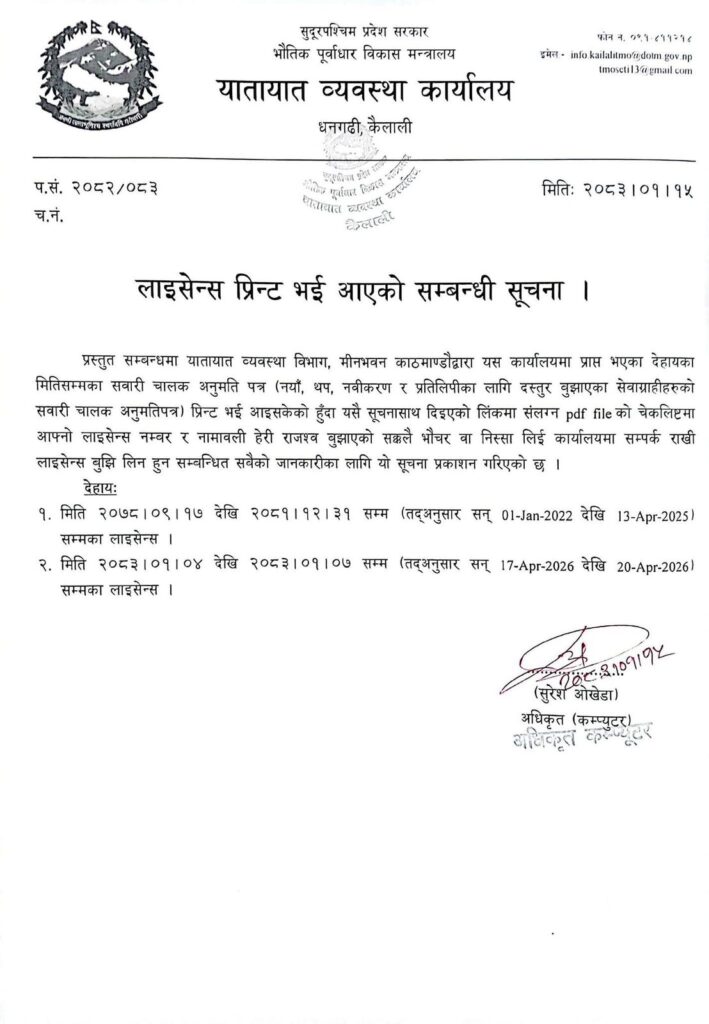 कार्यालयका अनुसार विभिन्न मितिसम्म आवेदन दिएका (नयाँ, थप, नवीकरण तथा प्रतिलिपि) सेवाग्राहीहरूको लाइसेन्स प्रिन्ट भइसकेको छ। सम्बन्धित सेवाग्राहीले आफ्नो लाइसेन्स नम्बर र नामावली हेरी राजस्व तिरेको भौचर वा निस्सा लिएर कार्यालयमा सम्पर्क गरी लाइसेन्स बुझ्न सक्ने जनाइएको छ।